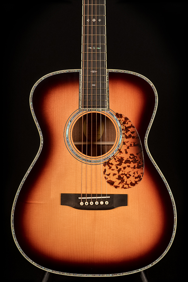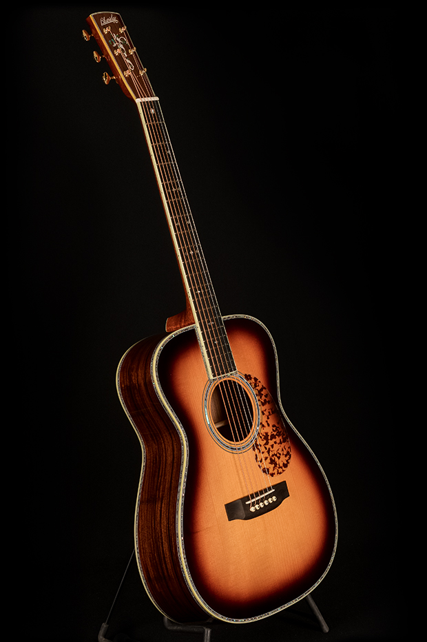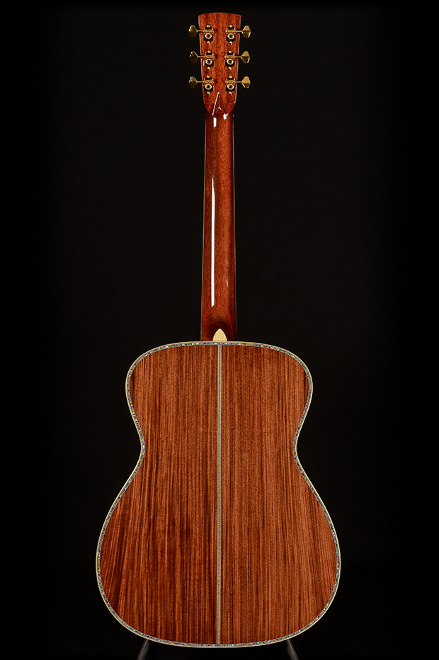 The top is crafted from the finest Adirondack spruce and braced with the same forward-x pattern parabolic braces as the 1930’s original. Rare and costly solid tonewood is used for the back and sides and gorgeous abalone pearl is inlaid on every border to make this flagship guitar a stunning visual display as well as a performance instrument. Truly, there is no finer guitar available in its price range to compare.