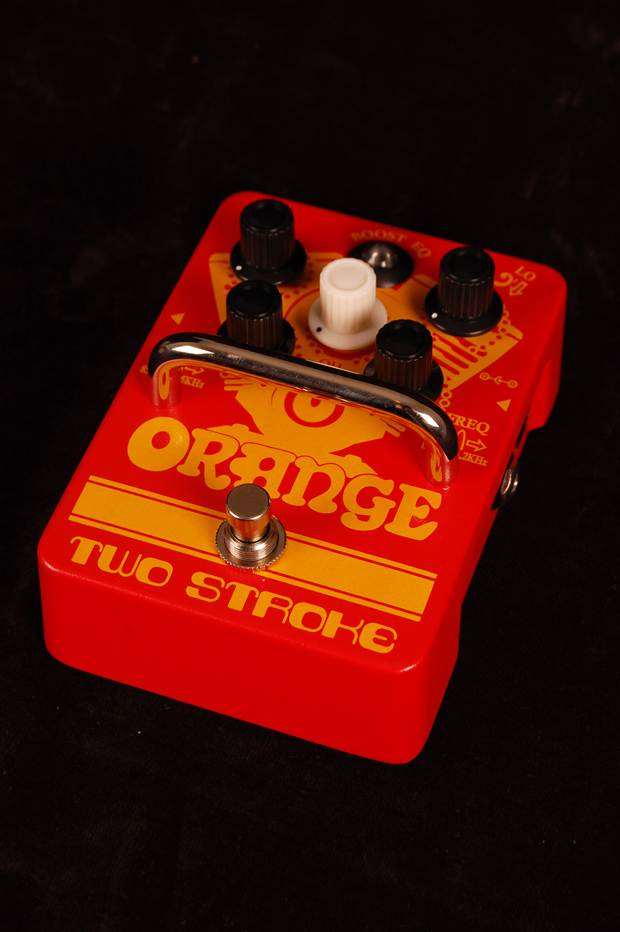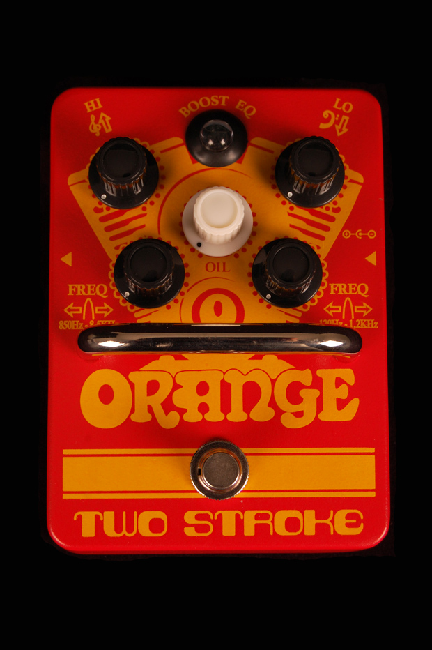 Like all Orange pedals, the Two Stoke features an internal charge pump which doubles the operating voltage to 18V. This has the effect of drastically increasing the headroom of the pedal whilst lowering the noise floor of the EQ. The result: the cleans are clearer and the tone circuit is significantly quieter than a regular 9V pedal. Plus it’ll take a hot signal without floundering, meaning the Two Stroke stacks really well with overdrive and distortion pedals. The Two Stroke can be powered by 9V battery or standard DC adapter, or for even more output can also run on 12V DC.