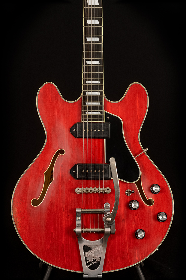 Acoustically it’s loud and snappy, with quick attack and a dry, woody sustain; plugged in, the dog-ear Lollar P-90s translate that air into articulate cleans and a punchy midrange that cuts without harshness. The Bigsby B7 adds smooth vibrato for chords and swells, and the guitar stays responsive at lower gain where touch and picking dynamics matter most.