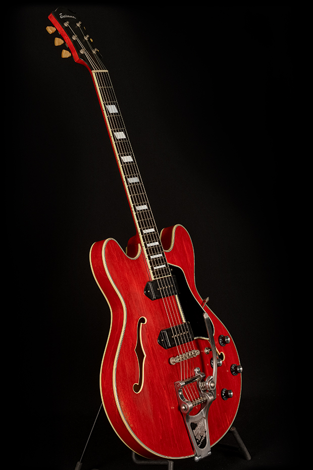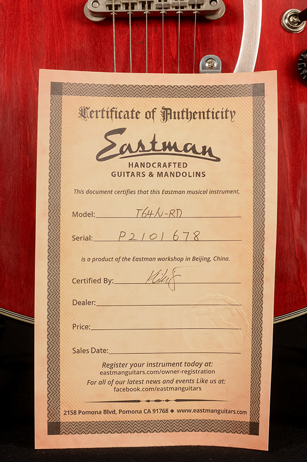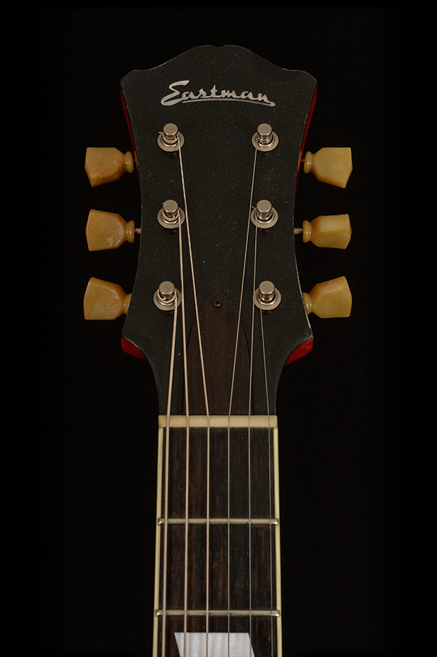 The Eastman T64/v is a lively, fully hollow 16″ thinline with clear inspiration from a certain golden age American guitar of the 50s. Eastman’s Antique Varnish finish and lightly aged hardware give it a discreet vintage look without the fragility of vintage guitars.