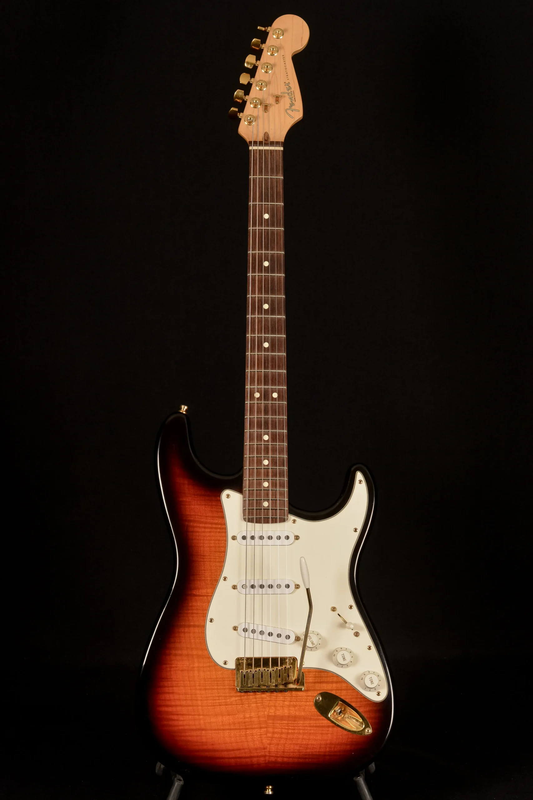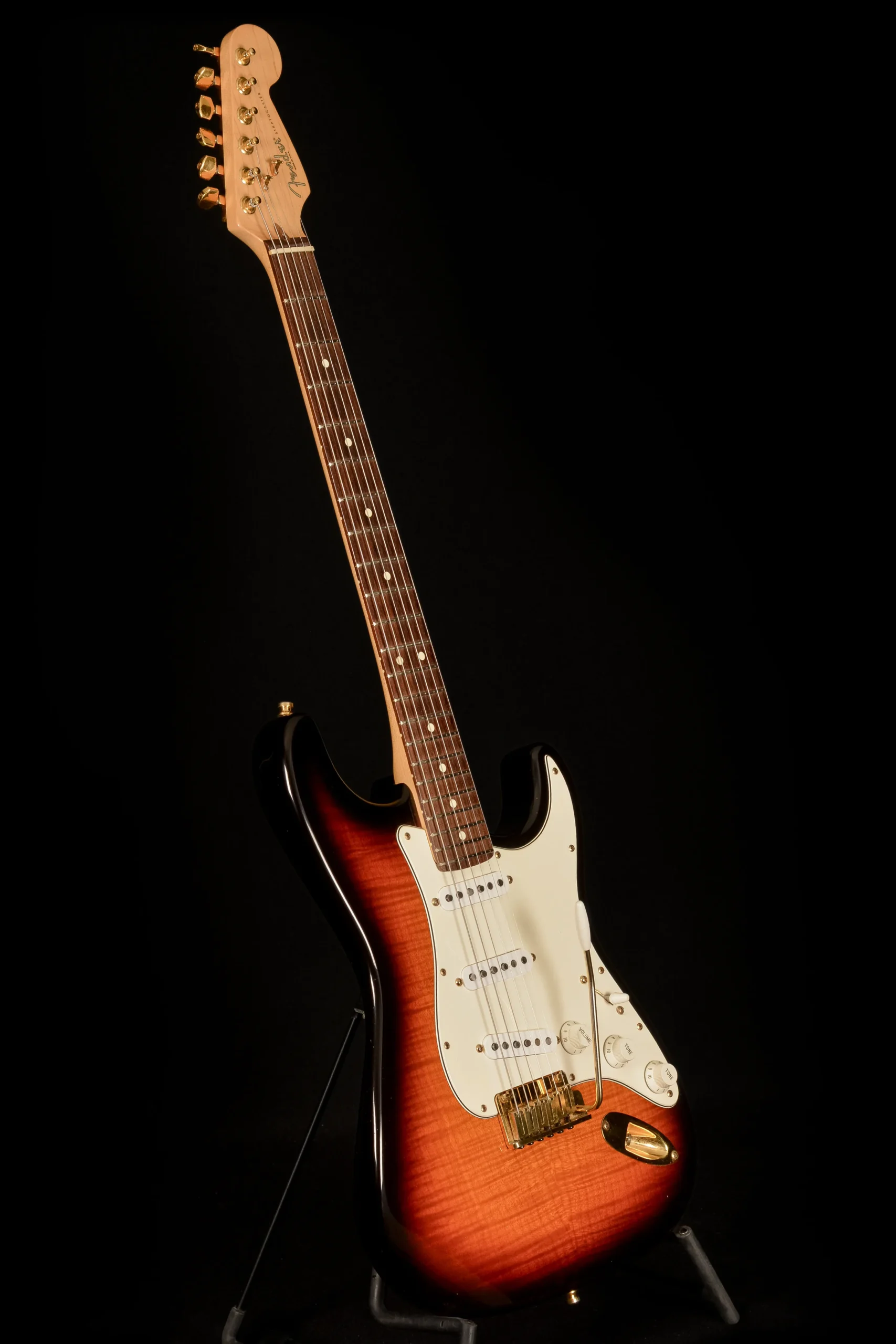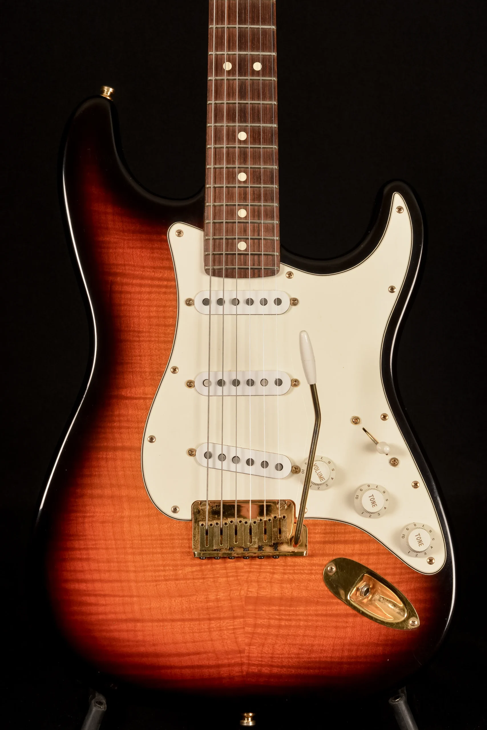 This example is number 1245 and comes in sunburst with a flame maple top and back, rosewood fingerboard and gold hardware. It has standard minor playwear, frets at approximately 95%, and is loud, resonant and twangy like a good Strat should be. Weight is 3600g.