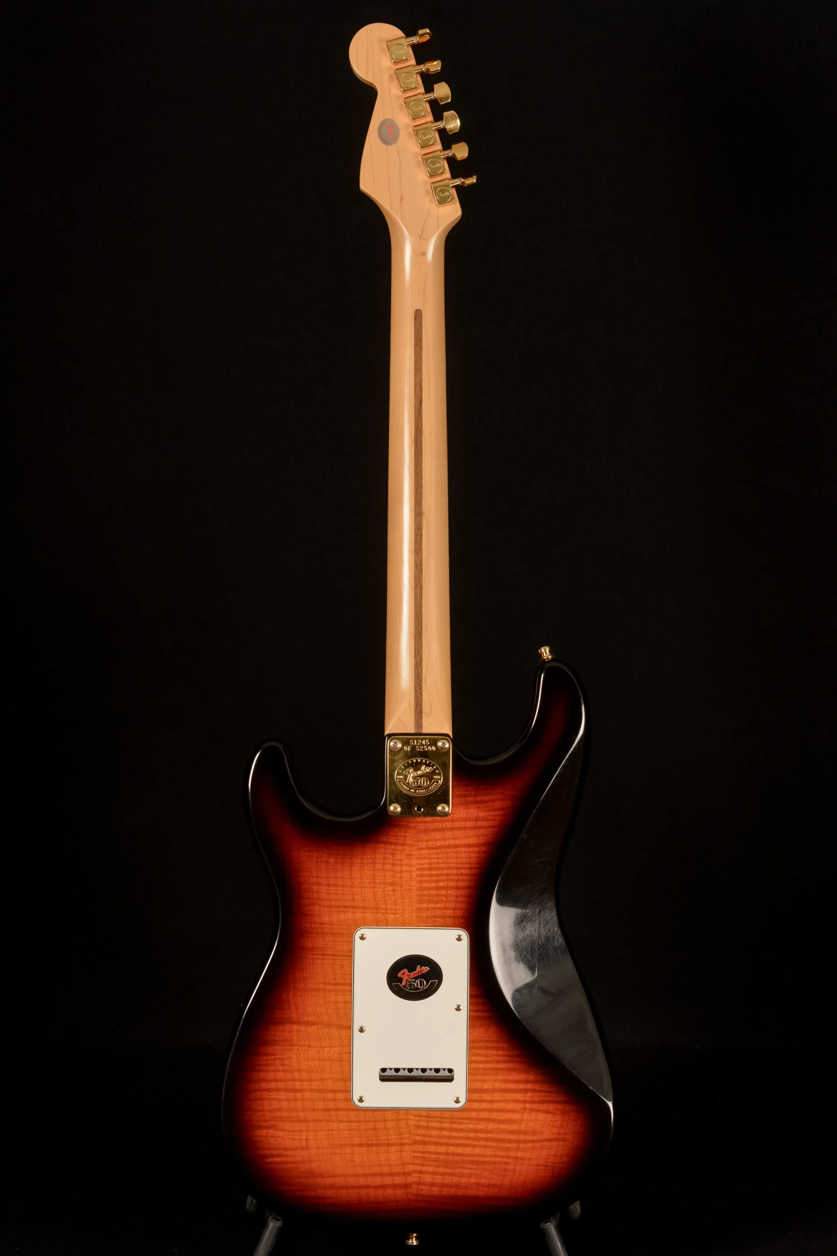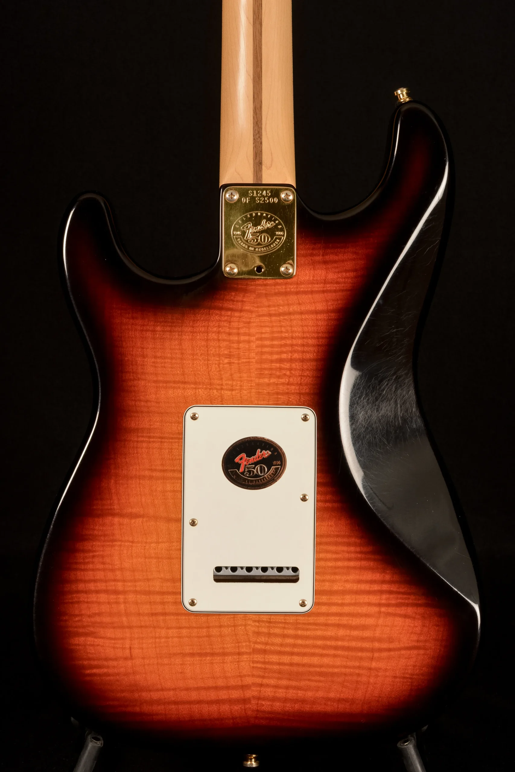 For Fender’s 50th anniversary in 1996, the company issued a limited Anniversary American Standard series with gold-plated hardware, figured maple veneer top and back, vintage-style pickups, a commemorative neck plate with edition numbering, and a black tolex vintage-style case. Only 2500 were made.