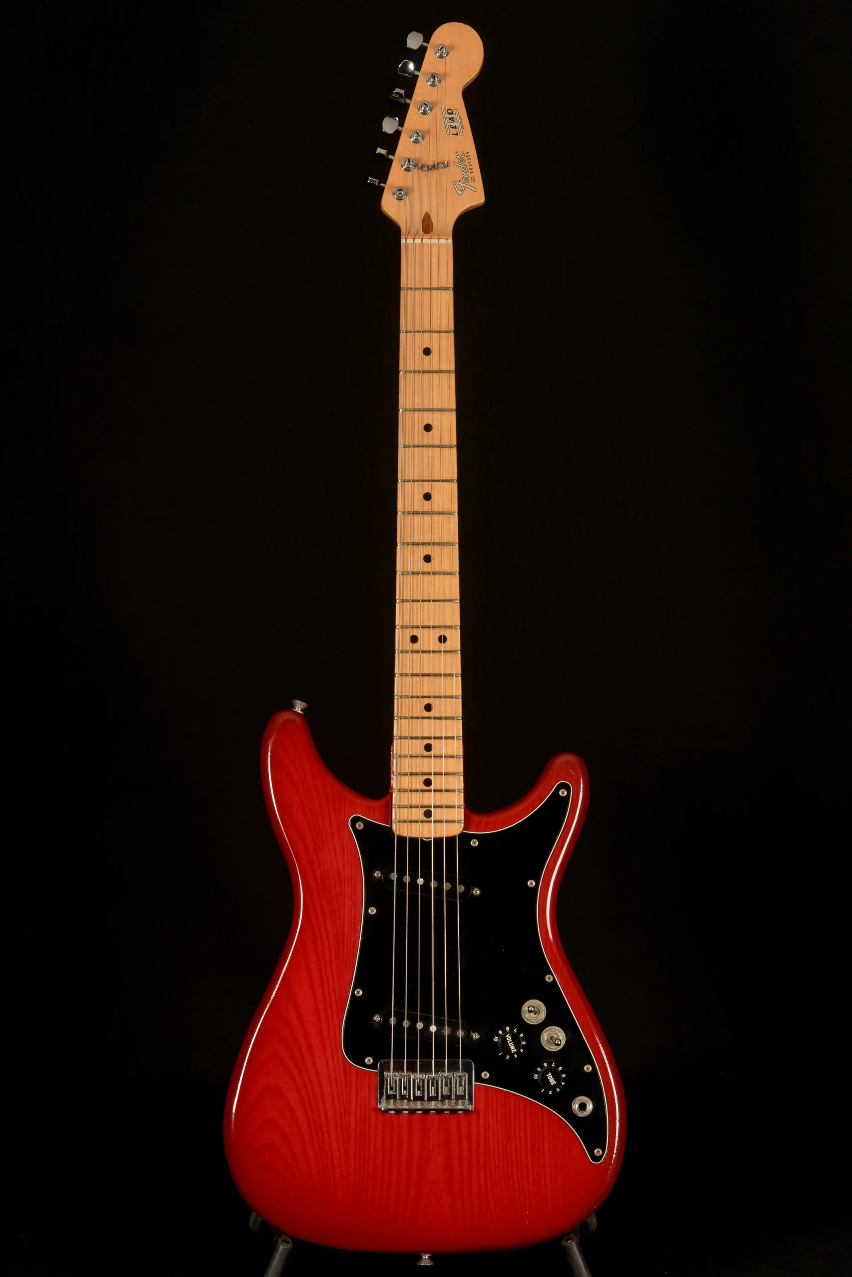 This 1981 example is a Fender Lead II in Wine Red with a maple neck and black pickguard. The Lead II layout is all about practicality: two single-coils, a 3-way pickup selector, and the extra phase switch for the out-of-phase sound when you run both pickups together.