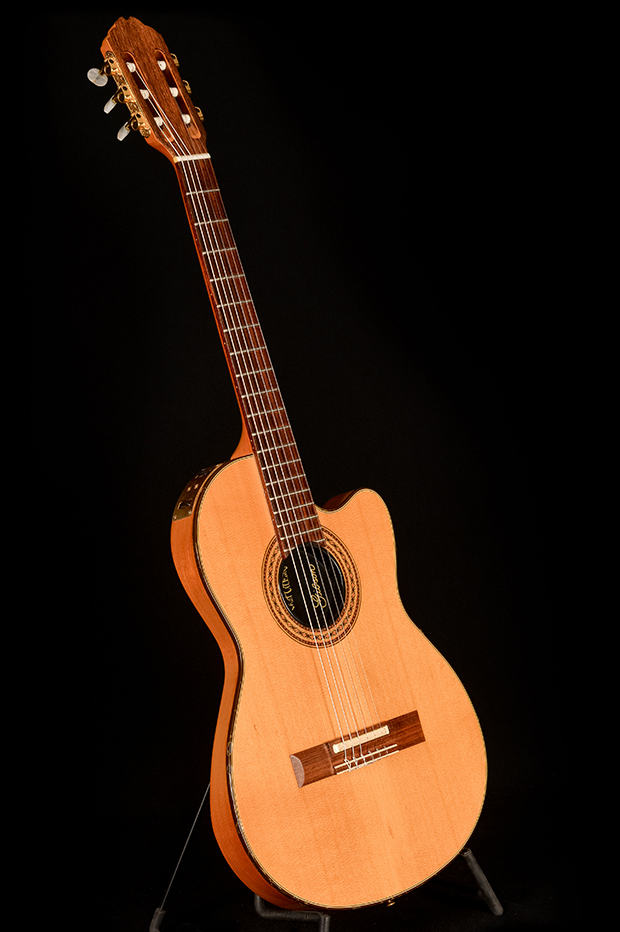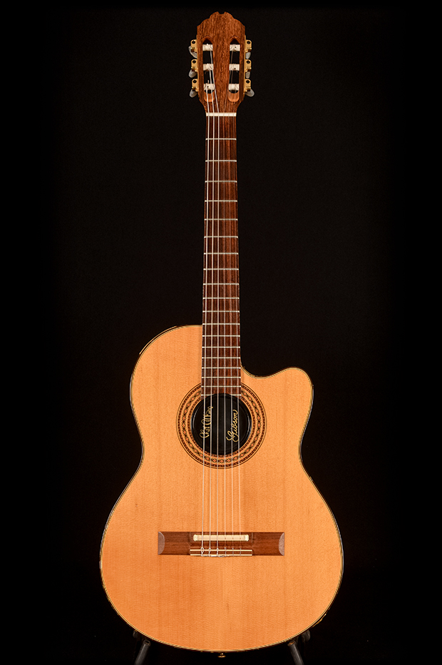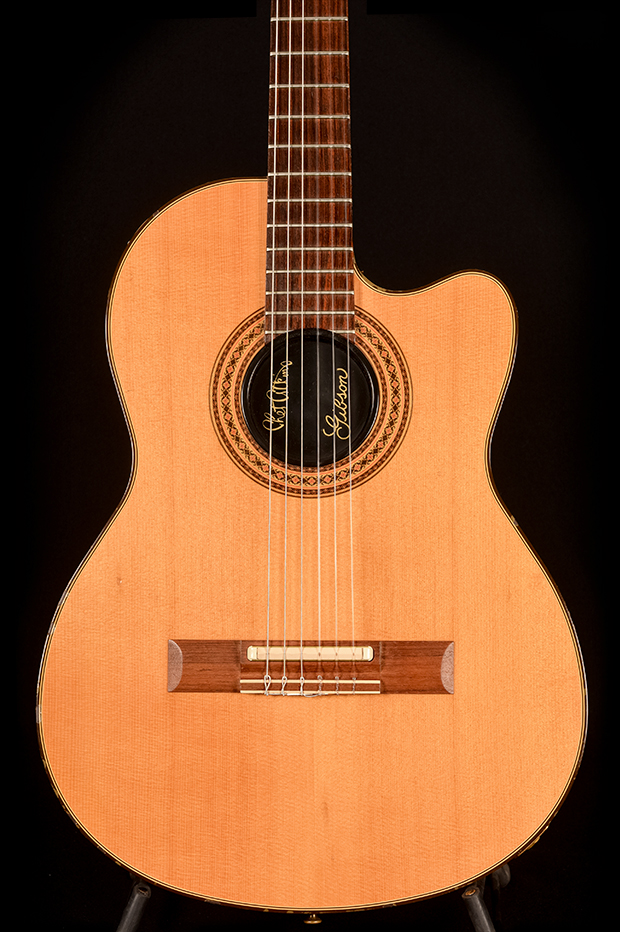 Originally developed with Chet Atkins to solve on-stage feedback, the Classical CE is built with a chambered mahogany body, spruce top, and an under-saddle transducer pickup. This model was known for its ability to deliver a clear, resonant tone with minimal handling noise, and was one of the first, if not THE first amplified nylon-string that really worked live and loud without sacrificing any of the familiar nylon feel.