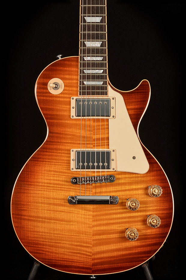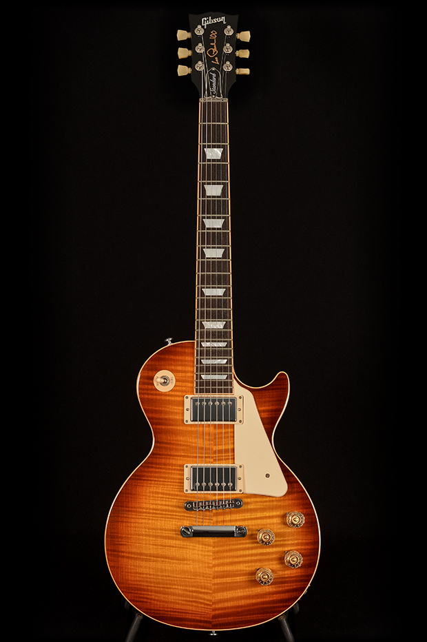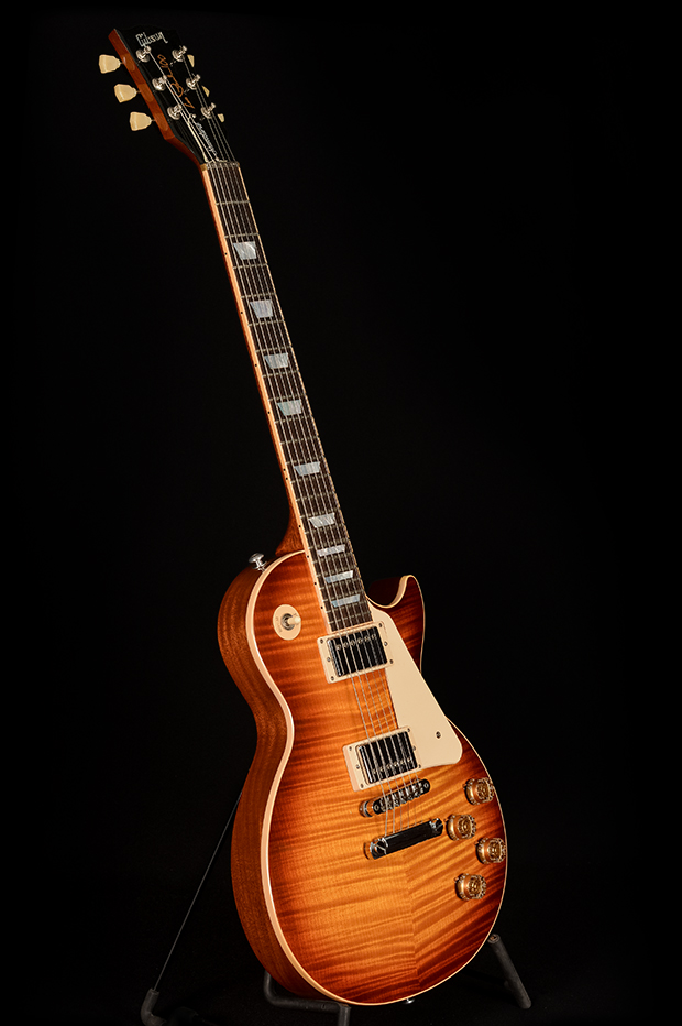 The 2015 Standard uses an asymmetrical ’60s SlimTaper neck with a compound-radius rosewood fingerboard and mother-of-pearl trapezoid inlays. The modern weight-relieved mahogany body with figured maple top keeps classic Les Paul construction while reducing mass. Hardware includes a Tune-o-matic bridge with titanium saddles and a stopbar tailpiece. Electronics feature Burstbucker Pro humbuckers with push/pull options for coil-split, phase, and a direct “pure bypass” to the jack. Finish is gloss nitrocellulose.