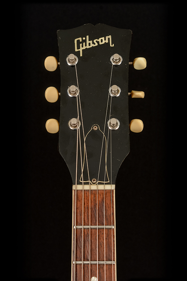 - Headstock front details: Gibson logo and blank bell-shaped truss rod cover