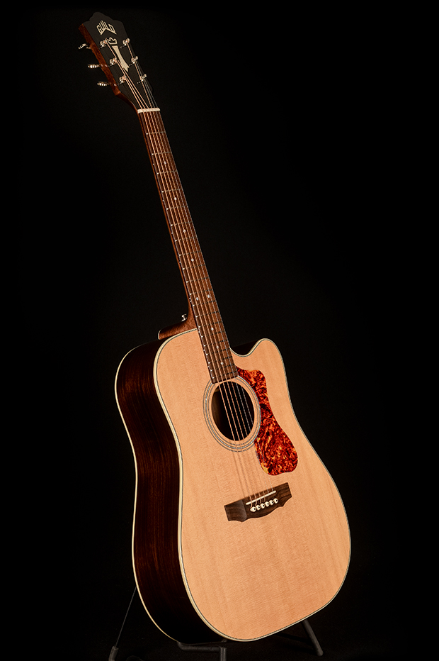 The full-bodied and powerful tone of this Guild dreadnought provides guitarists with a classic acoustic sound and balanced voicing. Built with a solid Sitka spruce top and solid rosewood back and sides, the D-150CE Natural also features an elegant cutaway for access to higher frets, and a hidden Guild/Fishman GT-1 Pickup System.