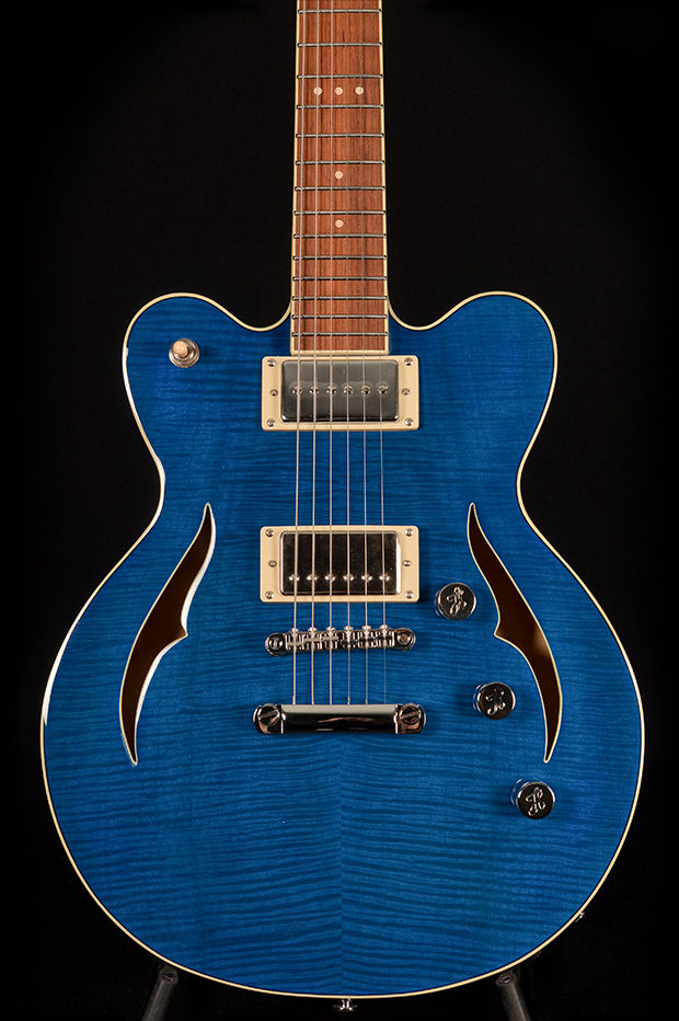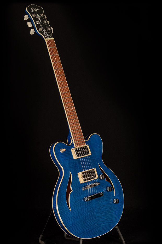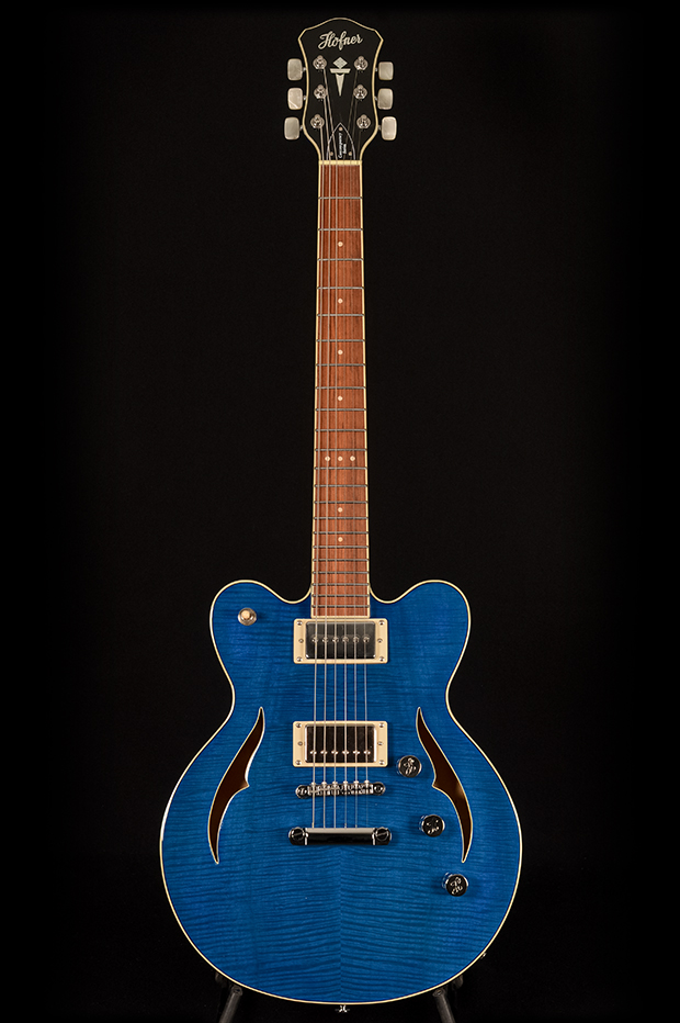 Featuring a semi-acoustic flame maple body with solid spruce centre block, rosewood fingerboard with classic Höfner clay dots, two full size humbucking pick-ups and four control layout with 3 way switch.