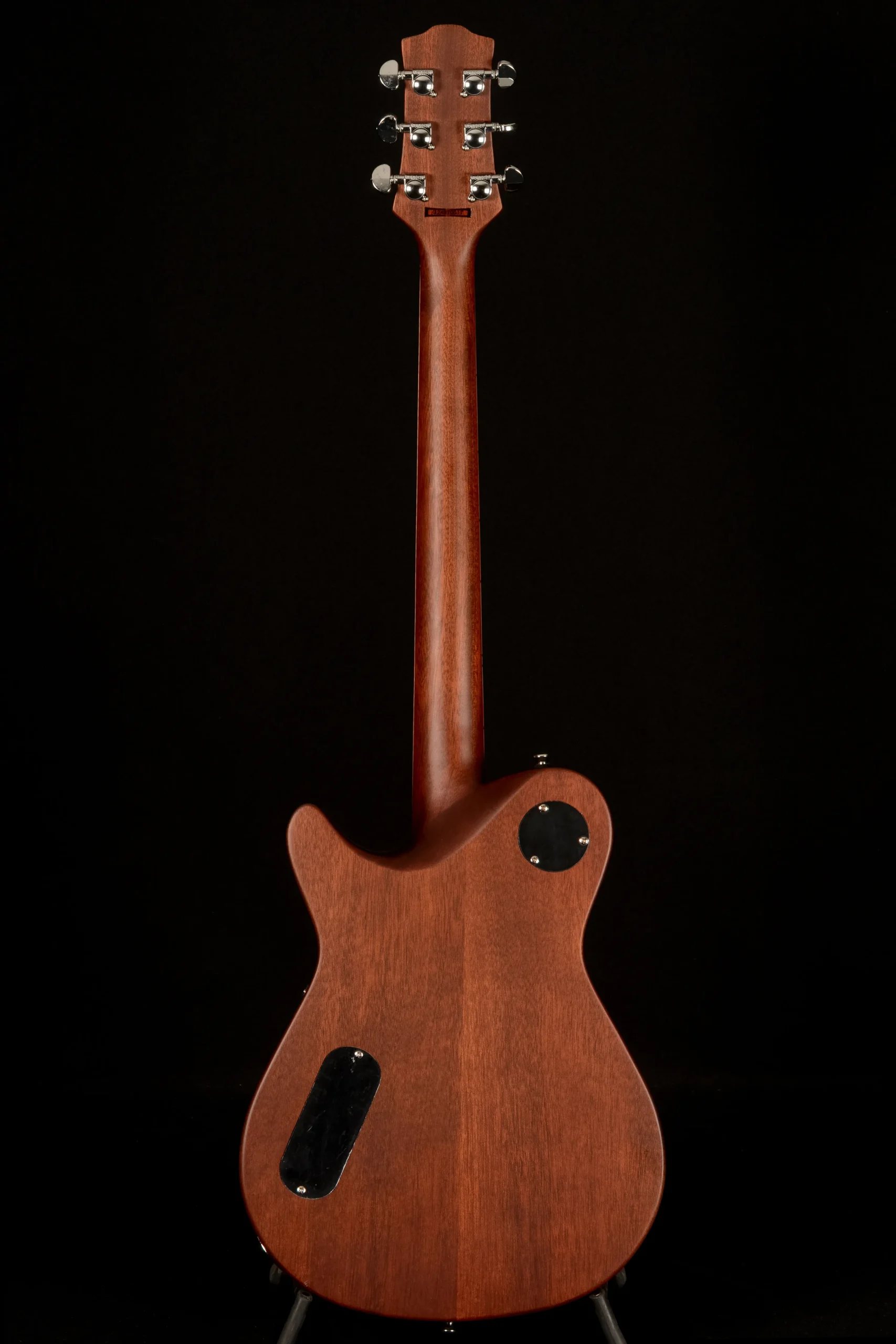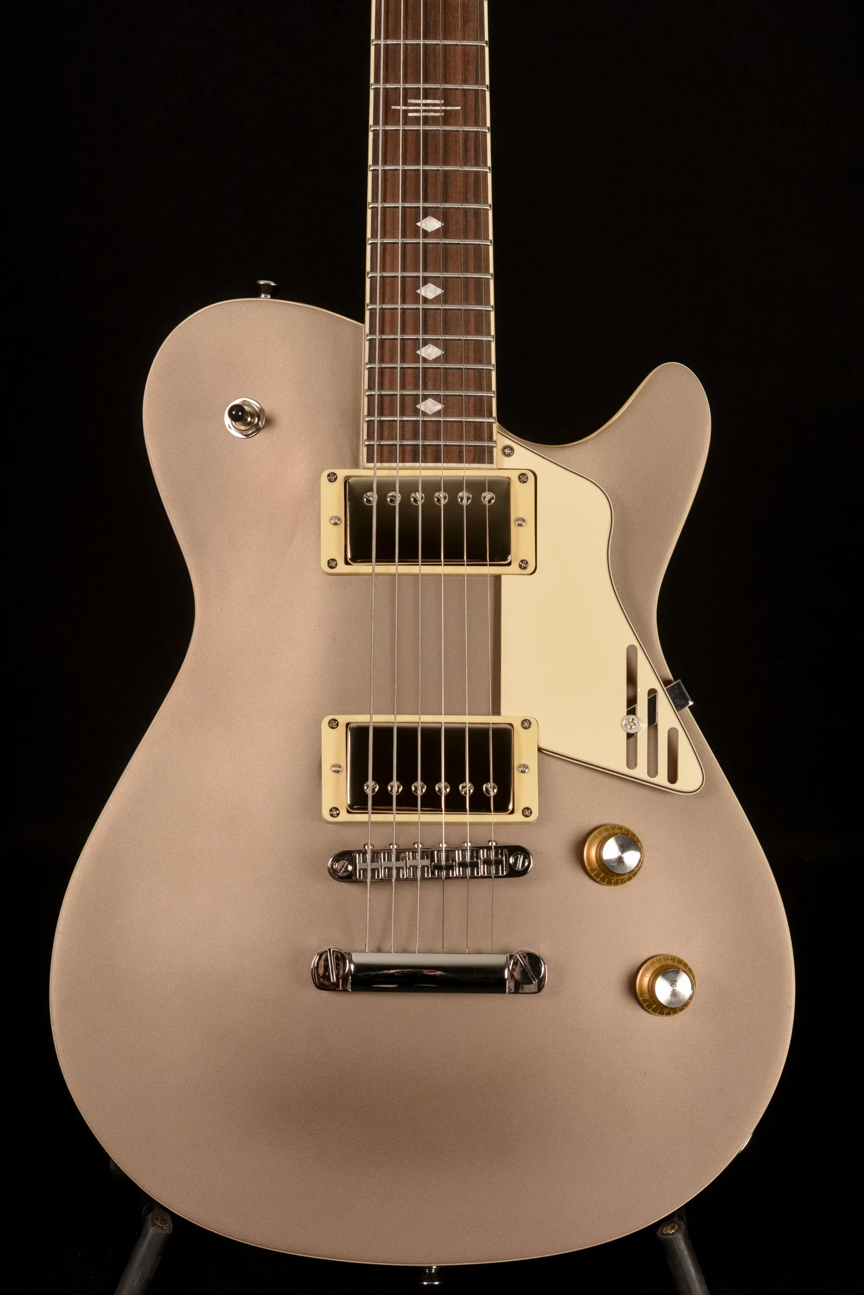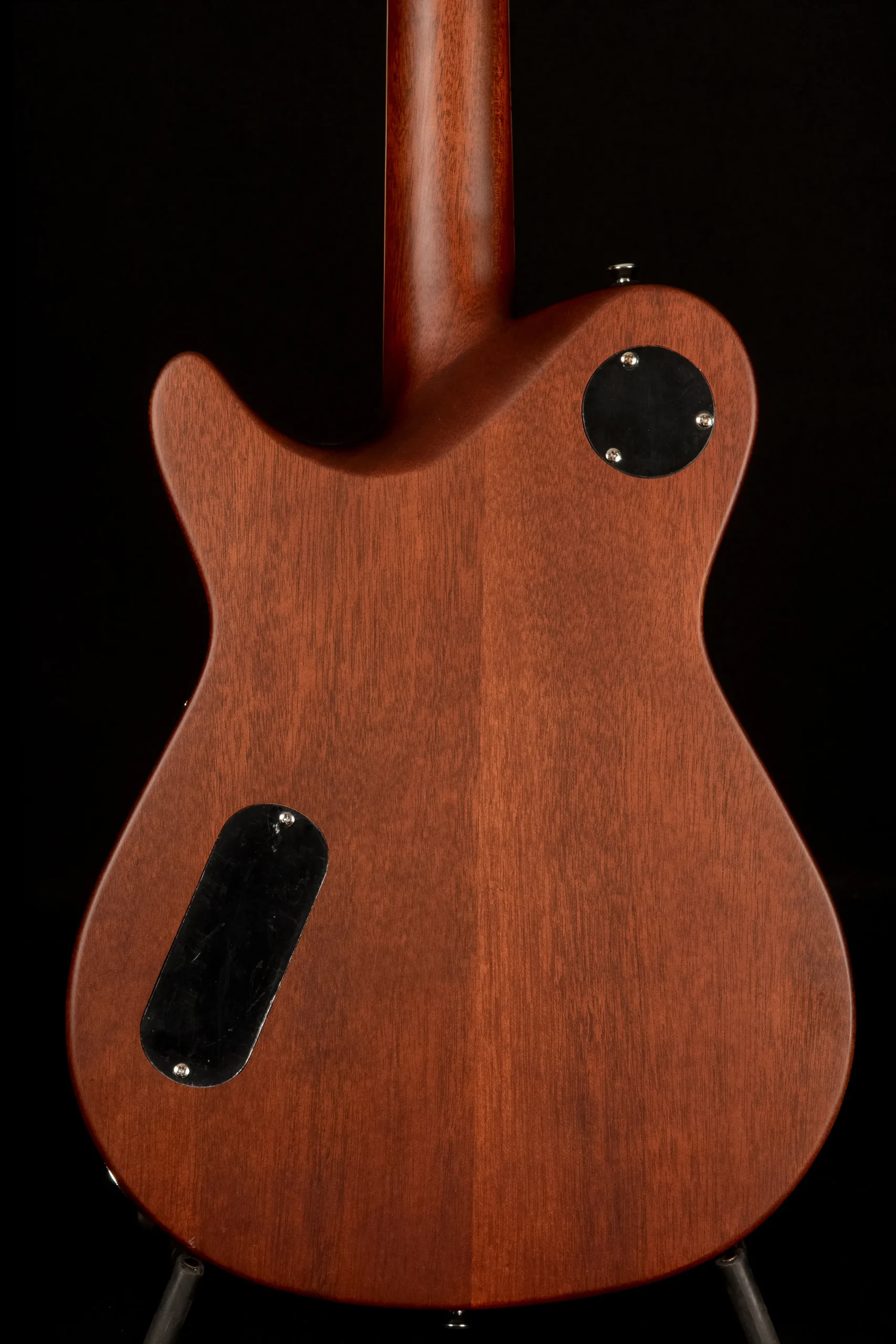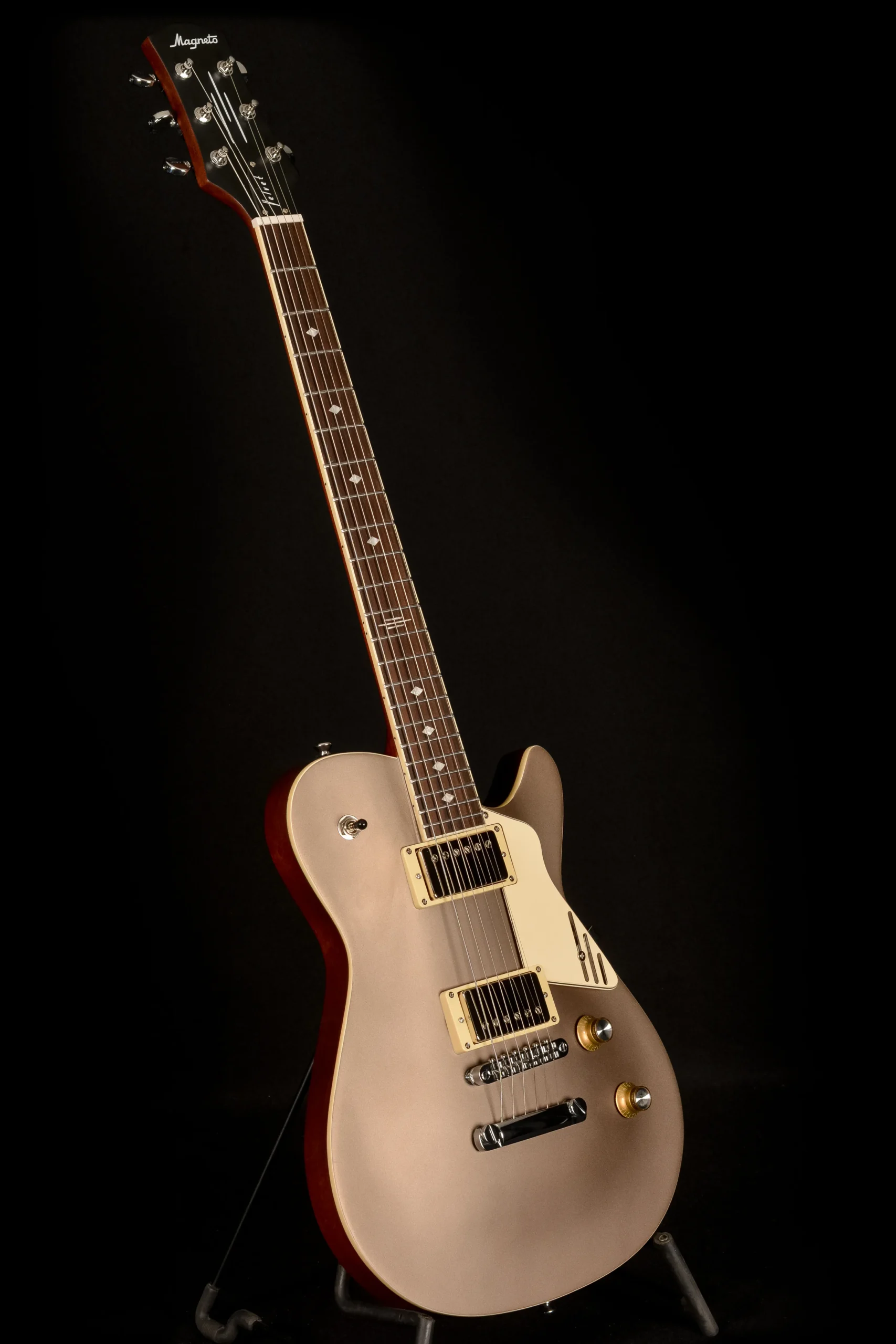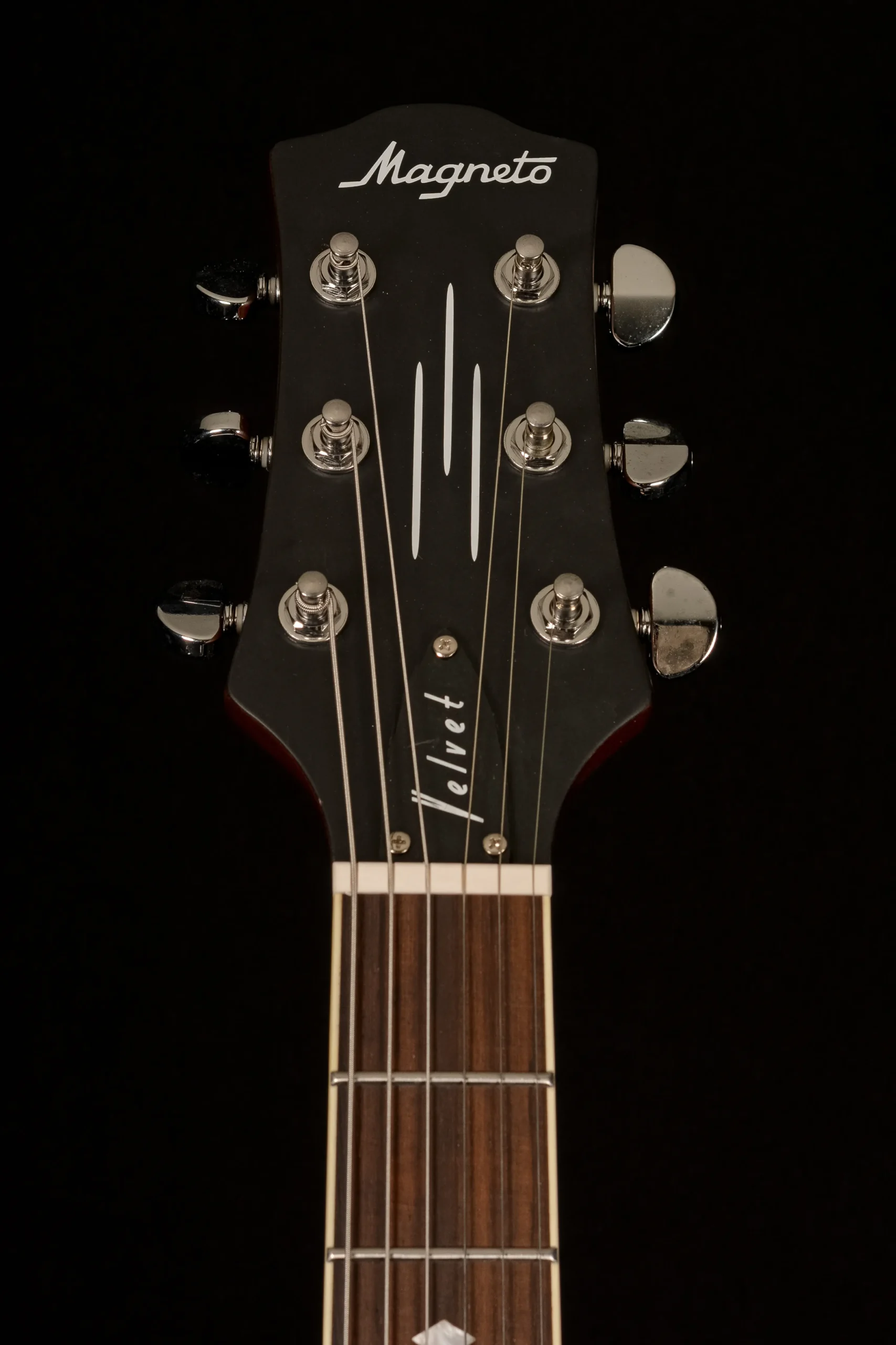 The body is made of African Mahogany that is chambered with a carved top. The neck is made of African Mahogany and a Rosewood fingerboard adorned with the Magneto Rhombus inlays. A bone nut will ensure best tonal response. The Velvet headstock has a 14° angle and sports Grover Tuners. The neck to body transition was sculpted in order to ensure the best access to the higher fret positions.