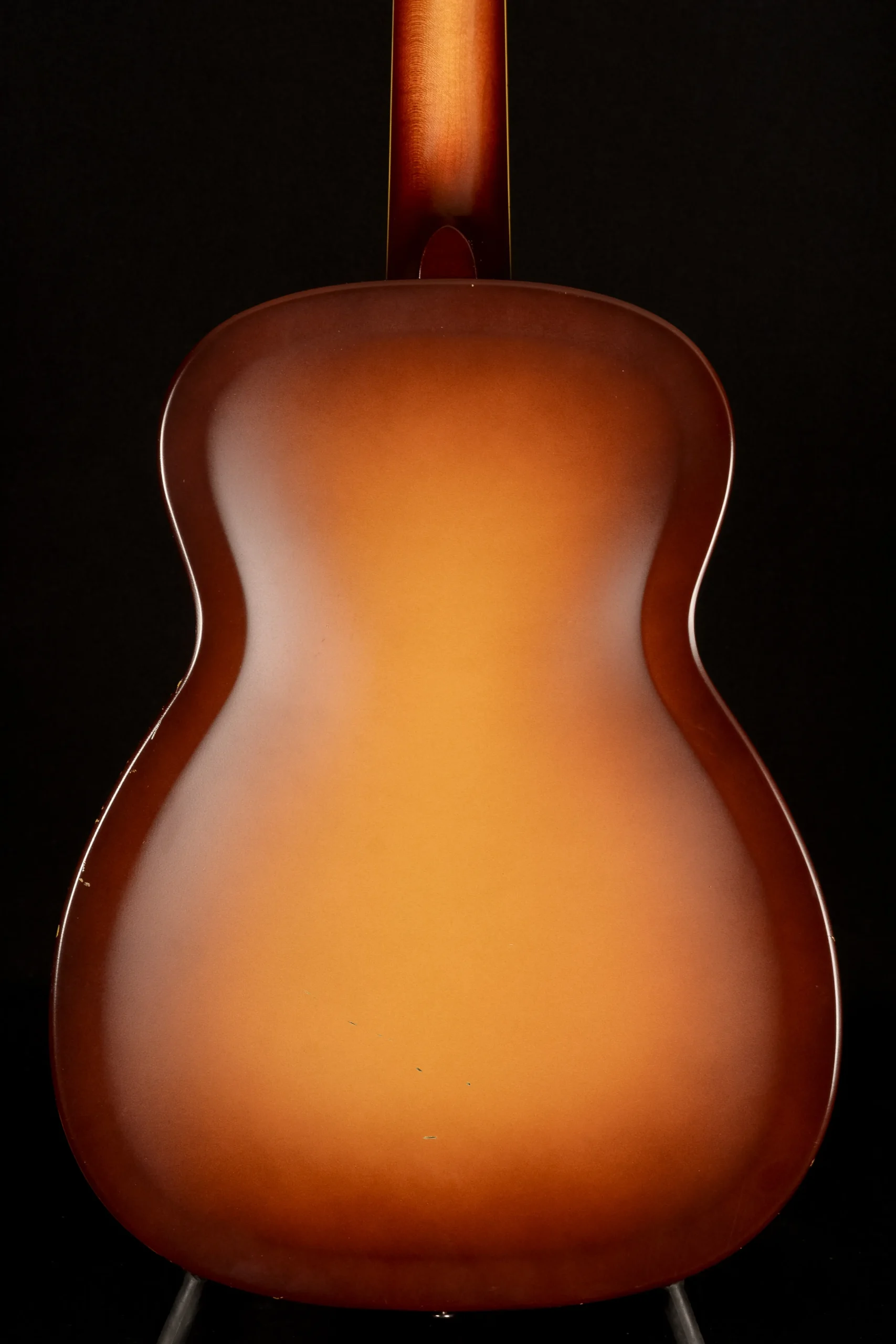 - Condition: Many small dings in finish, natural use patina, minor finish lifting around heel, some fret wear and dimpling in cowboy chord area