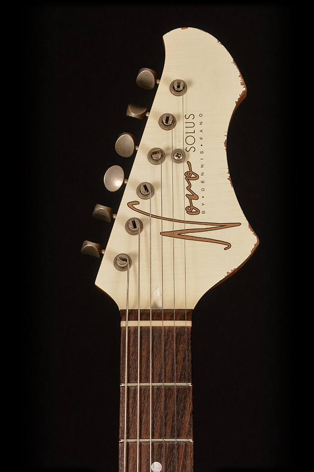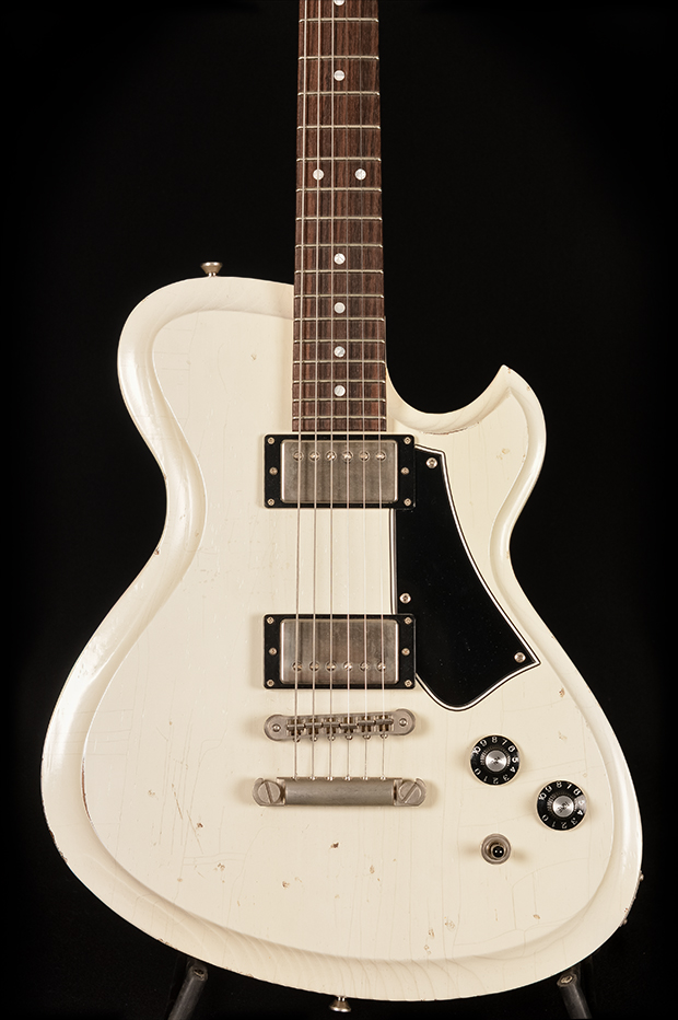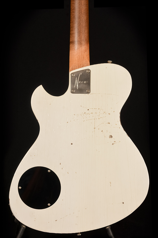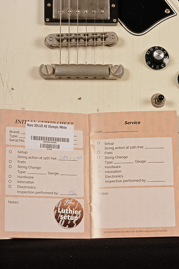 The Novo Solus H2 features an aged pine body finished in Olympic White, with an elegant German carve on the top. The maple neck has a chunky C shape and is sanded for a smoother, more playable feel, while the rosewood fingerboard has a very playable 10-14 compound radius.