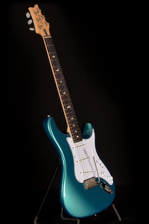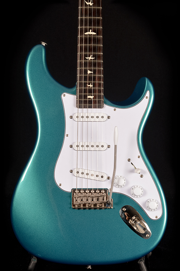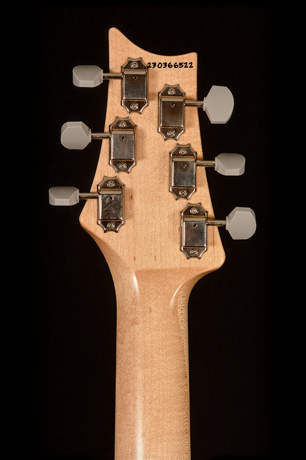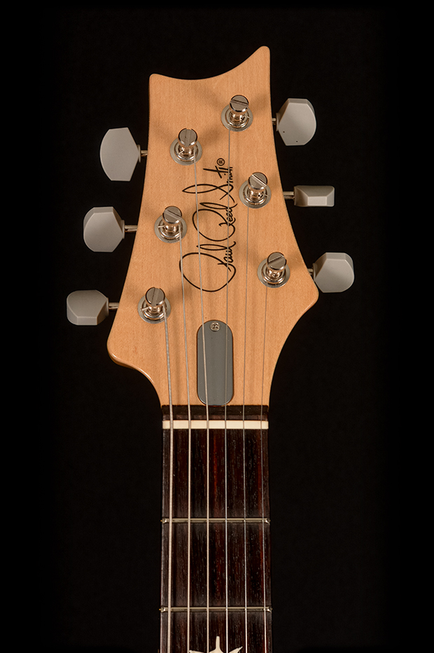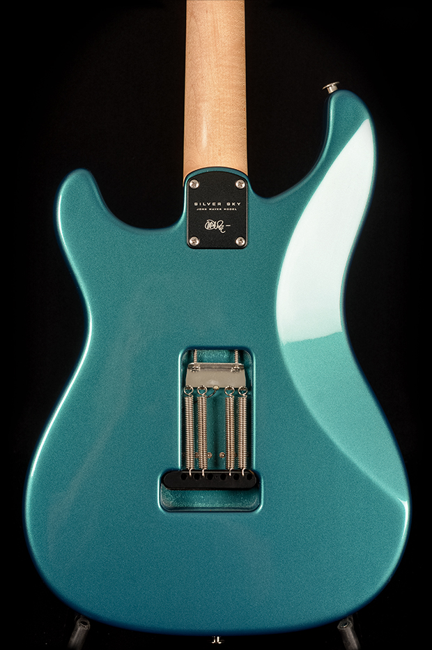 Some of the Silver Sky’s other unique features include the headstock shape, tuners, bridge, pickups, and neck and fretboard options. The headstock shape is based on PRS’s trademark design, but inverted both to accommodate Mayer’s playing style and also to keep a consistent length of string behind the nut, which makes staying in tune easier. The tuners are a traditional vintage-style, closed-back tuner, but with PRS’s locking design. The steel tremolo takes the patented PRS design and incorporates Gen III knife-edge screws. Setup flush to the body in the neutral position so that the tremolo bridge only goes down in pitch, the bridge’s increased contact with the body allows the guitar itself to be acoustically louder, which in turn improves the signal to noise ratio of the single-coil pickups. The 635JM single-coil pickups are very round and full, with a musical high end that is never “ice-picky” or brash.