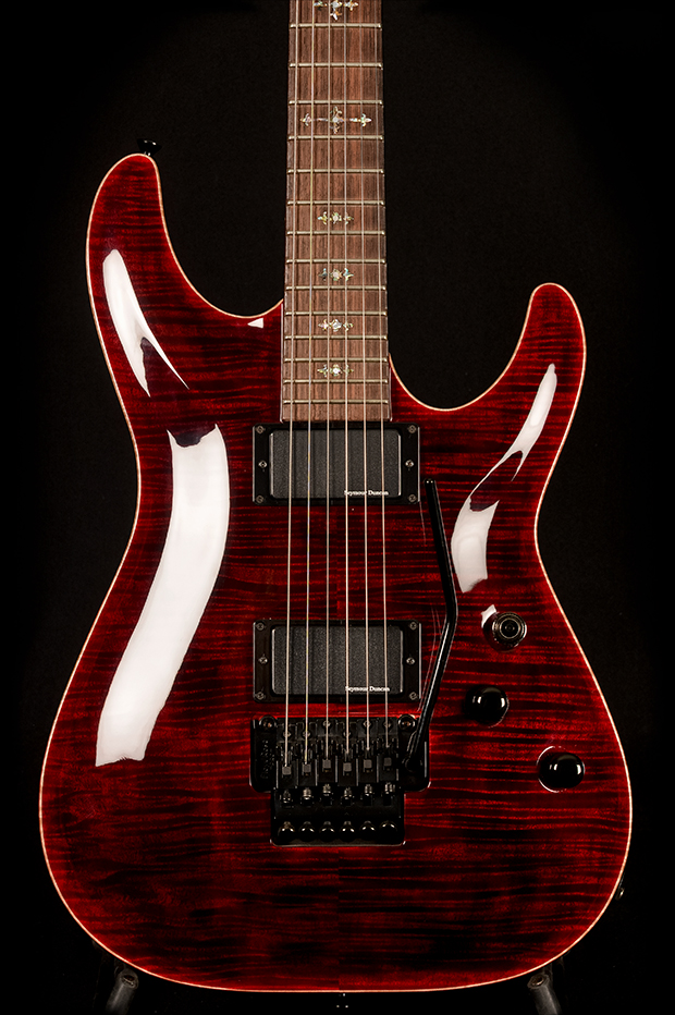 Schecter USA Hollywood Classic FR in Black Cherry is a U.S. Custom Shop build from Schecter Guitar Research, California. It features an exceptionally beautiful, three-dimensional, bookmatched flamed-maple top on a mahogany body, delivering a clear attack with solid sustain. A set mahogany neck supports a rosewood fingerboard with Custom Cross inlays for precise orientation across 24 jumbo frets.